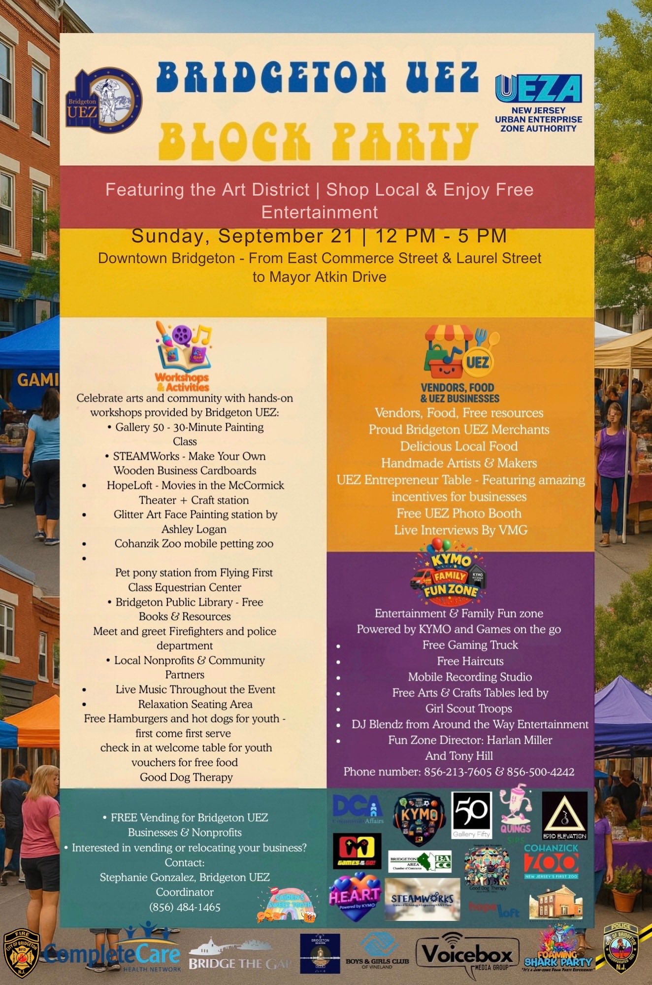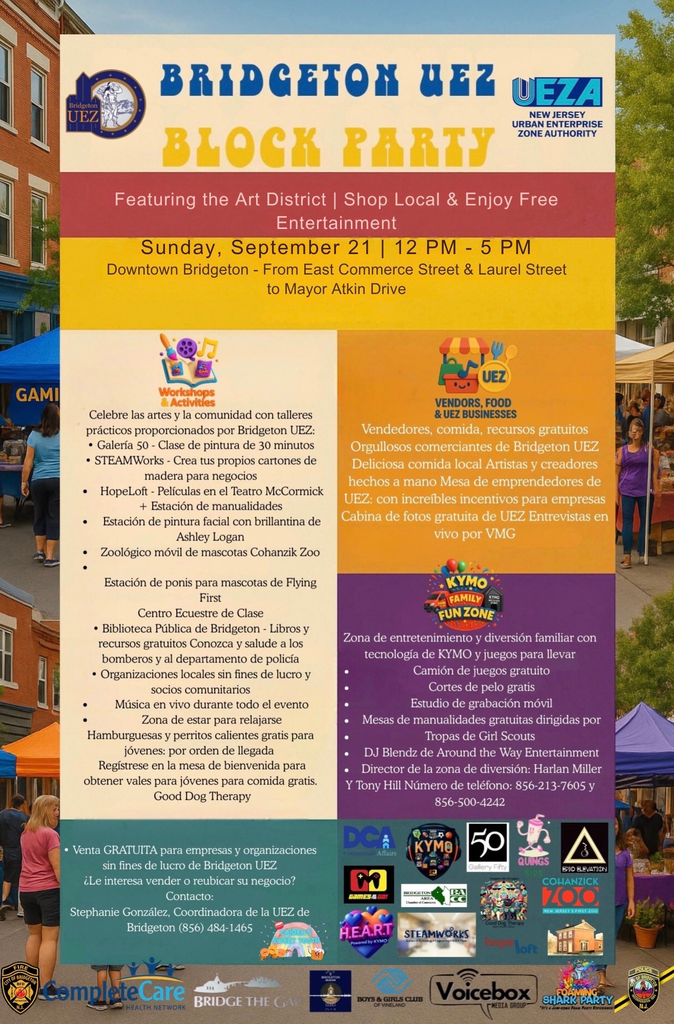 🌟🎉 Fiesta de Barrio de la UEZ de Bridgeton🎉🌟 Presentando el Distrito de Arte | Compra Local | Entretenimiento Gratis 📆Domingo, 21 de septiembre 🕛12 PM – 5 PM 📍Centro de Bridgeton (Desde East Commerce St. & Laurel St. hasta Mayor Aitken Drive) ✨Únete a nosotros para una celebración comunitaria GRATUITA llena de: 🎨Talleres de arte en vivo y actividades comunitarias 🎶Música en vivo y entretenimiento gratuito 🎮Zona Familiar KYMO – Camión de juegos, cortes de pelo gratis, manualidades y más 🐴Contacto con ponis y diversión animal con el Bridgeton Mobile Zoo, Flying First Class Equestrian Center y Foaming Shark Party 📖Vendedores locales, recursos y exhibiciones de pequeños negocios 🍔Comida deliciosa y refrigerios para toda la familia 📸Cabina de fotos gratis y entrevistas en vivo por VMG Esta es tu oportunidad de celebrar la creatividad, la cultura y la comunidad de Bridgeton — todo en un día emocionante! Trae a tu familia, trae a tus amigos y llenemos las calles de amor, arte y buenas vibras.💛 ✨ENTRADA GRATUITA | ABIERTO A TODOS✨ 👉Reserva la fecha, compártelo con tus amigos y nos vemos el 21 de septiembre! |