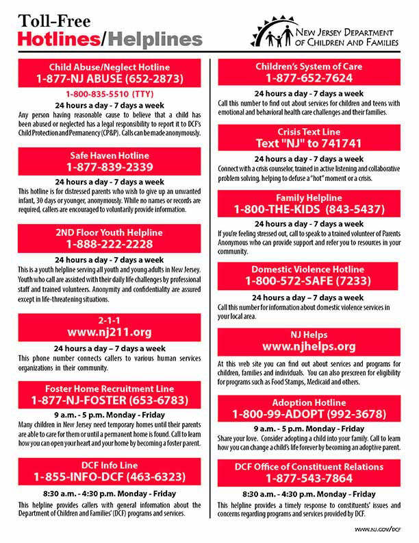 Reporting Child Abuse in NJ This reference sheet gives information about reporting child abuse including where to call, questions that will be asked and your legal obligation to report. Child Abuse/Neglect Print / Download English / Spanish