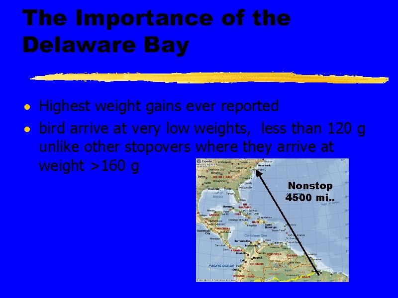 The horseshoe crab eggs help the red knot especially because they arrive in such poor condition. After a nonstop flight from Brazil, they arrive at weights as low as 90 grams, down from weights as high as 225 grams when they leave Brazil. In just a few weeks they must rebuild their weights for the flight to the Arctic.
