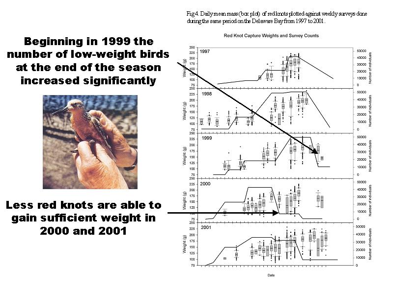 But the damage was done, and red knots began to show signs of decline. Starting in 1999, many knots couldn’t reach departure weights by the end of the month, a marked contrast to birds in 1997 and 1998. In 2000 the problem appeared to worsen with many birds leaving the bay before reaching departure weights, presumably to find alternative foods.