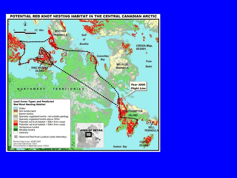 We began our Arctic investigation trying to determine where Delaware Bay red knots breed. Oddly enough, no one knew. Each year from 1999 to 2001, we placed transmitters on birds and tracked them in the Arctic. We found enough to create the first map of breeding habitat of the red knot in the Arctic. We were also able to locate a field site to study birds on the ground.