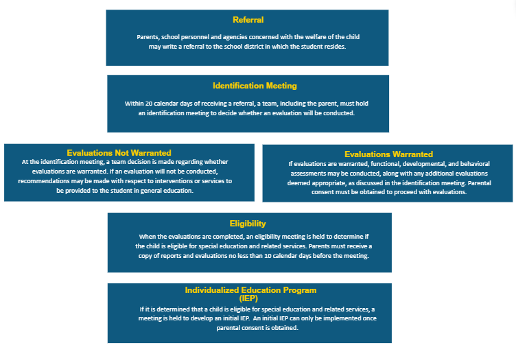 A referral is a written request for an evaluation that is given to the LEA to assess whether a child is eligible for special education services. Referrals for special education evaluations must be based on concerns regarding a student's educational performance and the suspected impact of a disability on their ability to succeed in the general education setting. Referrals can be made by: