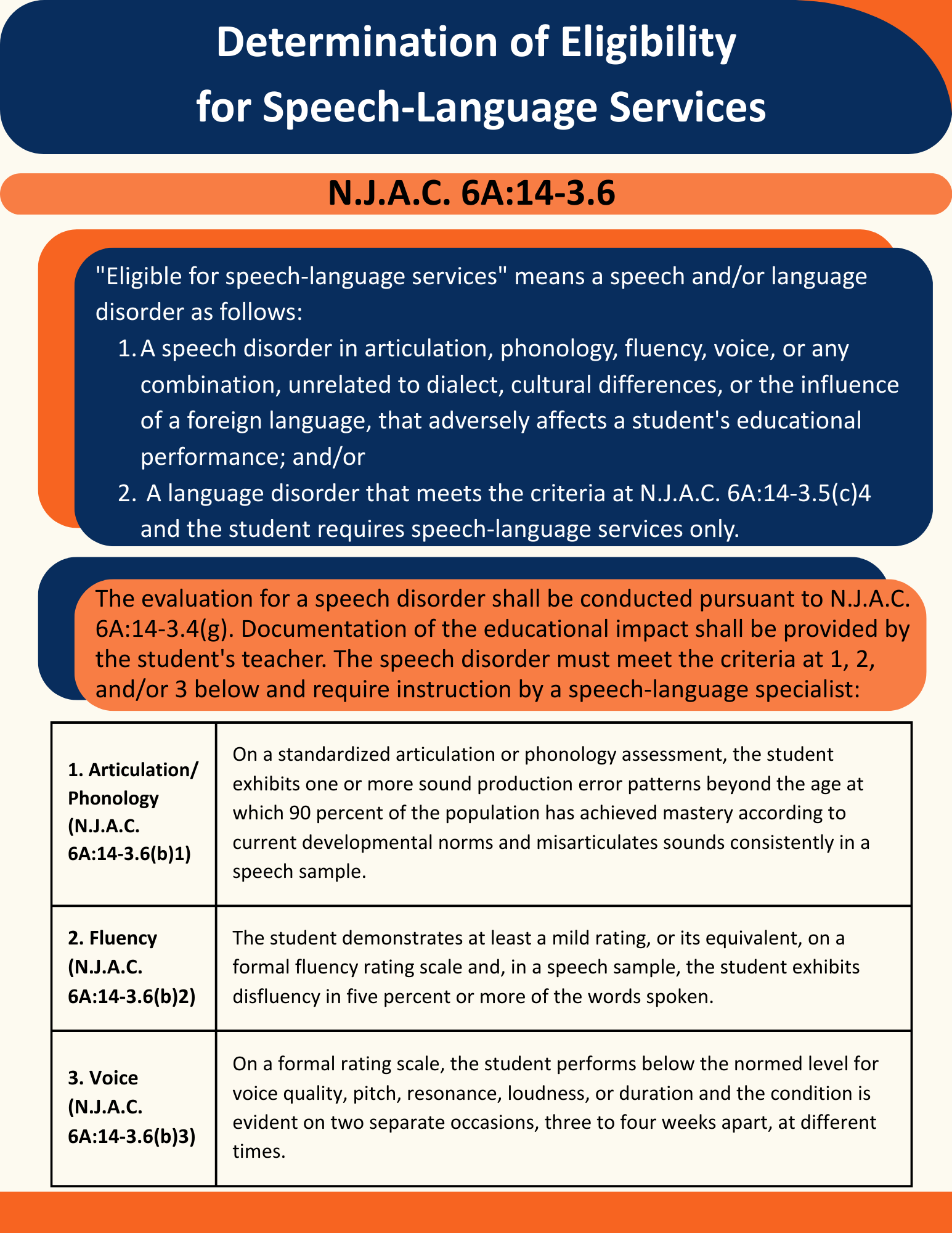 - A language disorder that meets the criteria at N.J.A.C. 6A:14-3.5(c)4 and the student requires speech-language services only.