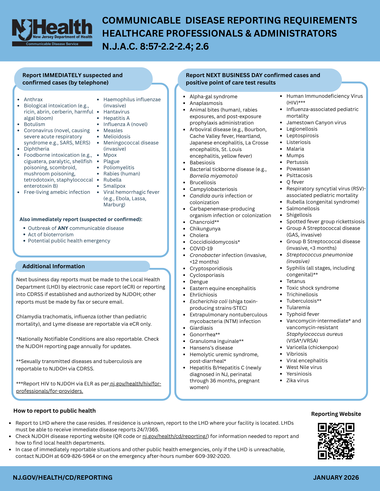 Healthcare professionals and administrators are legally required to report suspected and/or confirmed communicable diseases, outbreaks, and other public health emergencies to public health authorities in accordance with N.J.A.C. 8:57.