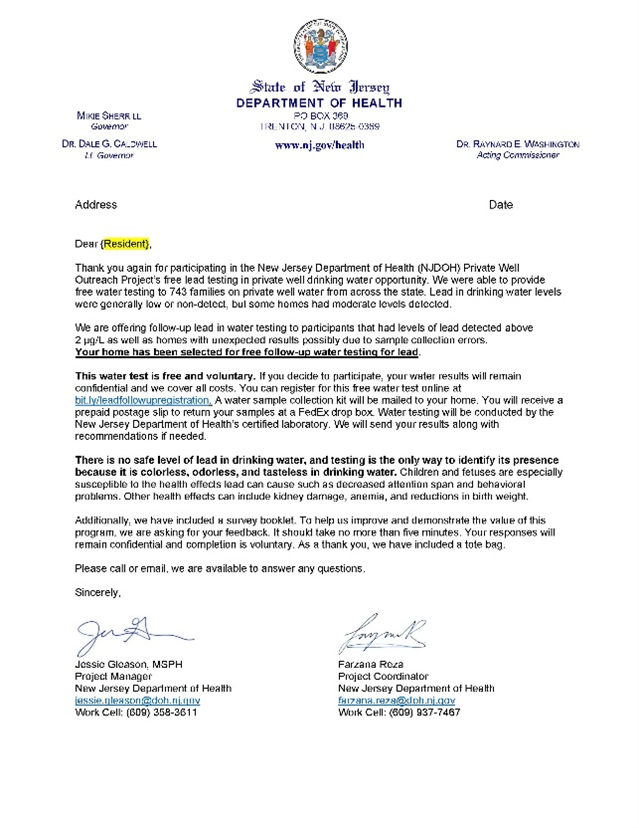 We are conducting a statewide initiative to sample lead in drinking water served by private wells. Letters are being sent to randomly selected homeowners to participate. Findings from this project will help us identify lead in drinking water concerns among private well owners in New Jersey.
