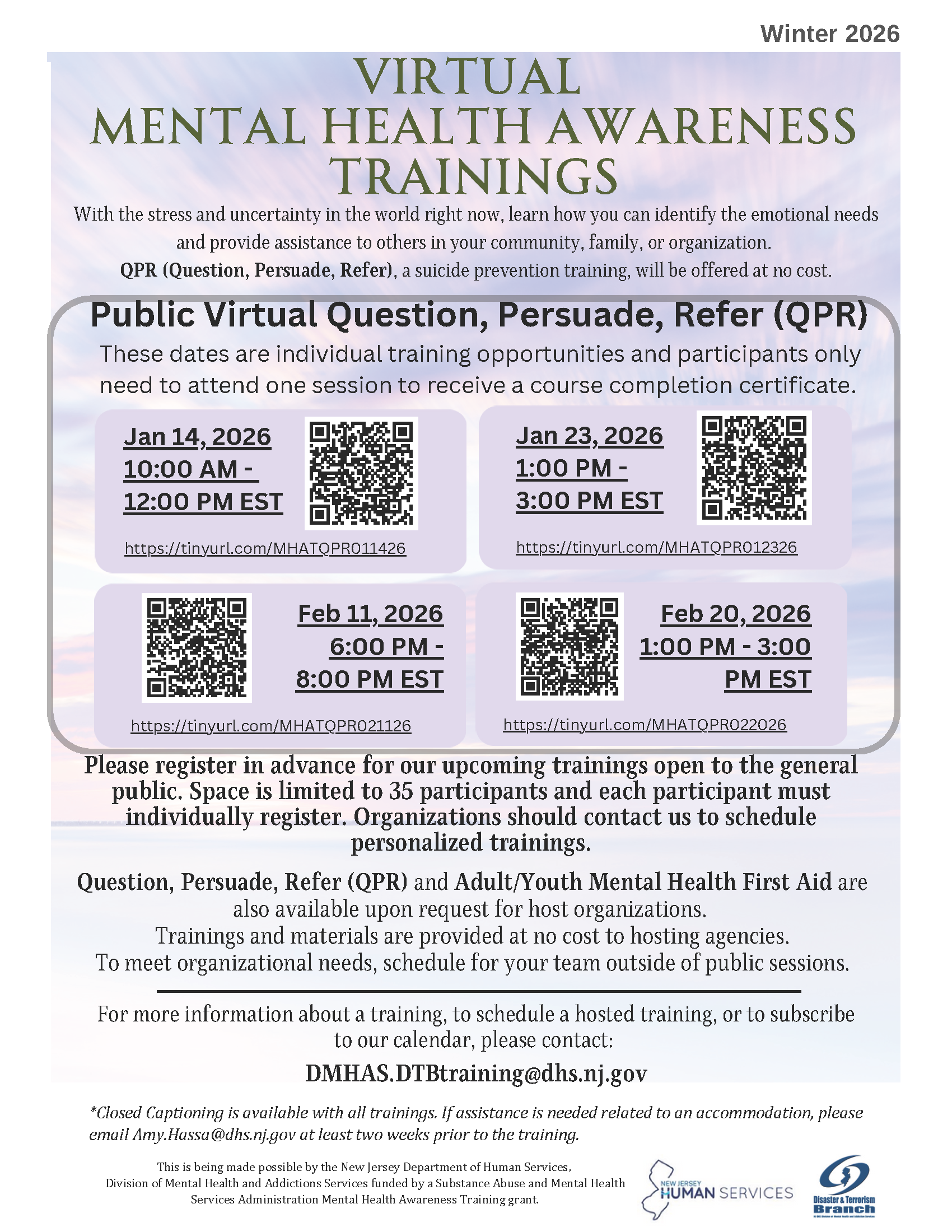 The Division of Mental Health and Addiction Services (DMHAS) serves as the Single State Agency (SSA) for Substance Use and the State Mental Health Authority (SMHA) as designated by the U.S. Substance Abuse and Mental Health Services Administration (SAMHSA). The Division oversees New Jersey's adult system of community-based behavioral health services. These agencies provide a full array of services, including substance use prevention and early intervention, emergency screening, outpatient and intensive outpatient mental health and addictions services, partial care and partial hospitalization, case management, medication assisted treatment for substance use, and long and short term mental health and substance use residential services, in addition to other evidence-based practices such as the Program for Assertive Community Treatment (PACT), supported employment and education, and supportive housing.