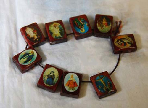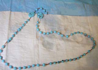 The unidentified female was wearing a blue rosary bead type necklace with a cross (shown above) and a wooden bracelet with religious icons/saints on it (shown above).