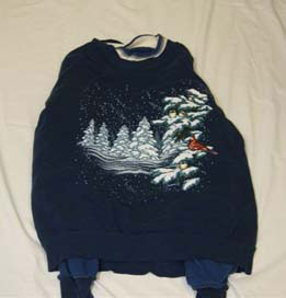 The unidentified female was wearing a red sweatshirt, a white t-shirt on top of the red sweatshirt, a white partial button down shirt that was wrapped around her waist, light green underwear, white socks, white Adidas brand sneakers with 3 black stripes. In her possession was a brown tote bag with the words New York (shown above). Inside the tote bag was a blue sweatshirt with a winter scene (snow covered trees and a cardinal) (shown above), black jeans with a zipper on the left and right side of the waist, a sun hat with blue flowers, a black/white bandana, and blue/yellow scarf with yellow flowers. The tote bag also had a toothbrush, cap, lighter, and area maps.