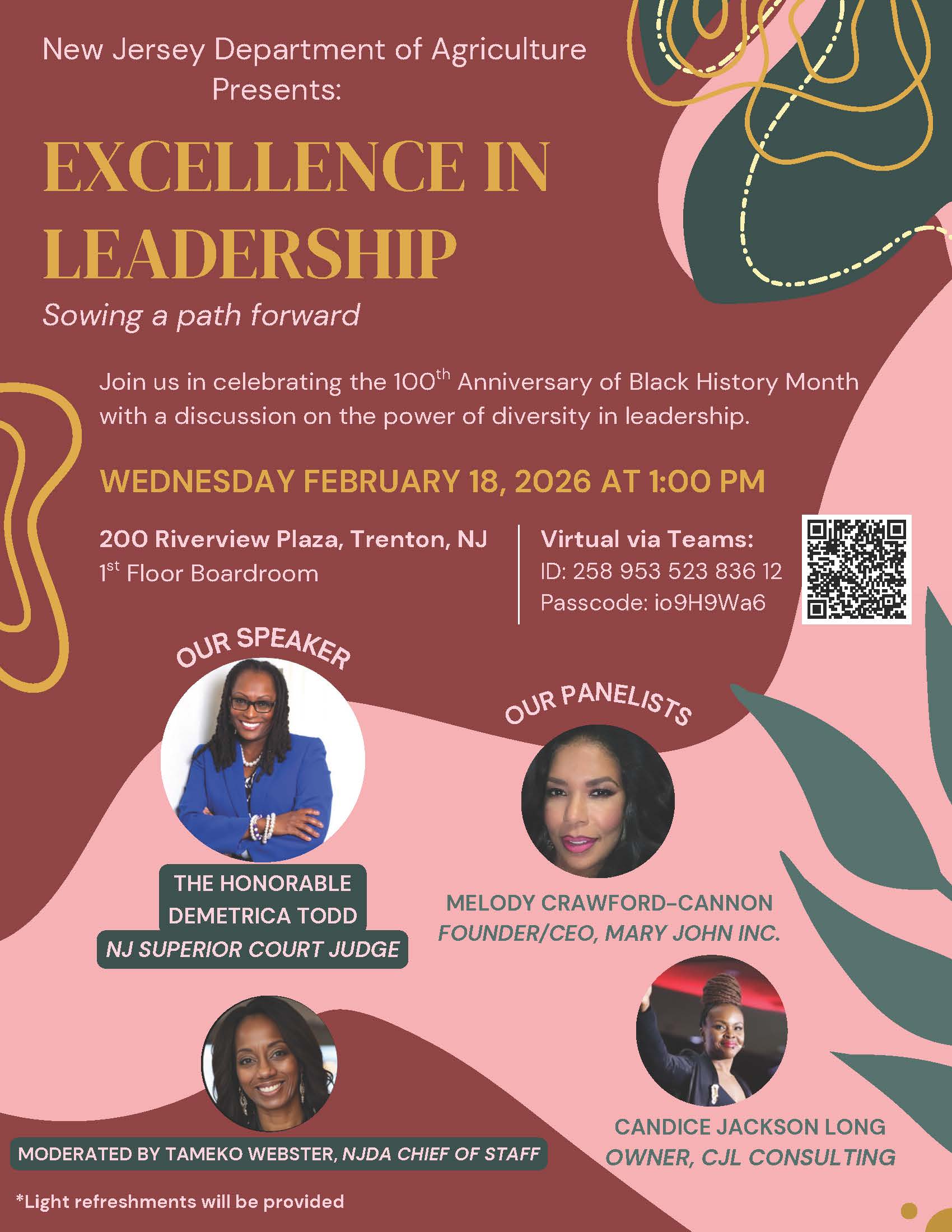 The New Jersey Department of Agriculture presents Excellence in Leadership: Sowing a Path Forward in recognition of the 100th Anniversary of Black History Month.