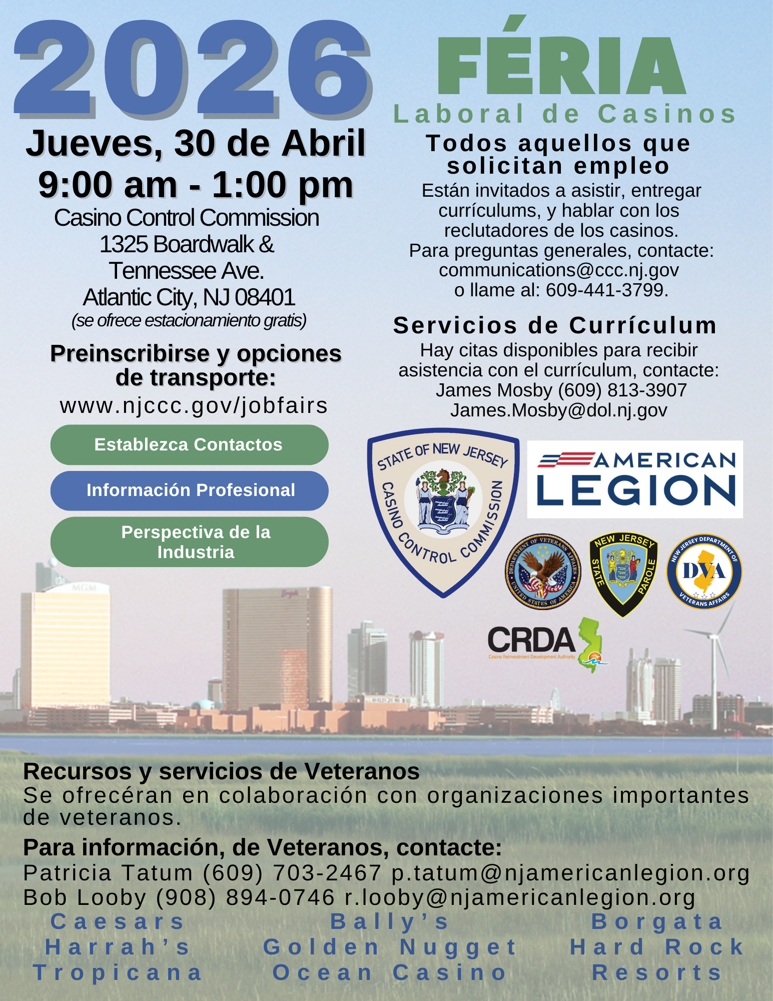 The annual Casino Career Fair (Féria Laboral de Casinos) provides job seekers with a unique opportunity to gain career information and casino industry insight while networking with representatives from all nine casinos in one location! All job seekers are invited to bring resumes and talk with casino recruiters. For general questions, please email or call 609-441-3799.