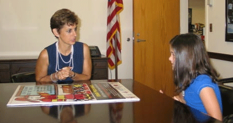 Department of Community Affairs (DCA) Commissioner Lori Grifa meets with Katie Boyle of Bayonne, the grand prize winner of the New Jersey Fire Safety Poster Contest for the 2009-2010 school year. Click here to see Katie's poster. |