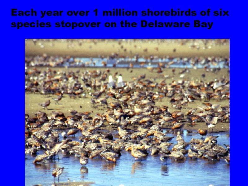 The Delaware Bay ranks as one of the world’s top three stopovers. Up until the early 1990’s over one million birds used the beaches and marshes of the Delaware Bay, all looking to rebuild weight to move on to Arctic breeding grounds. In recent years that number of birds has declined dramatically numbering less than 500,000.
