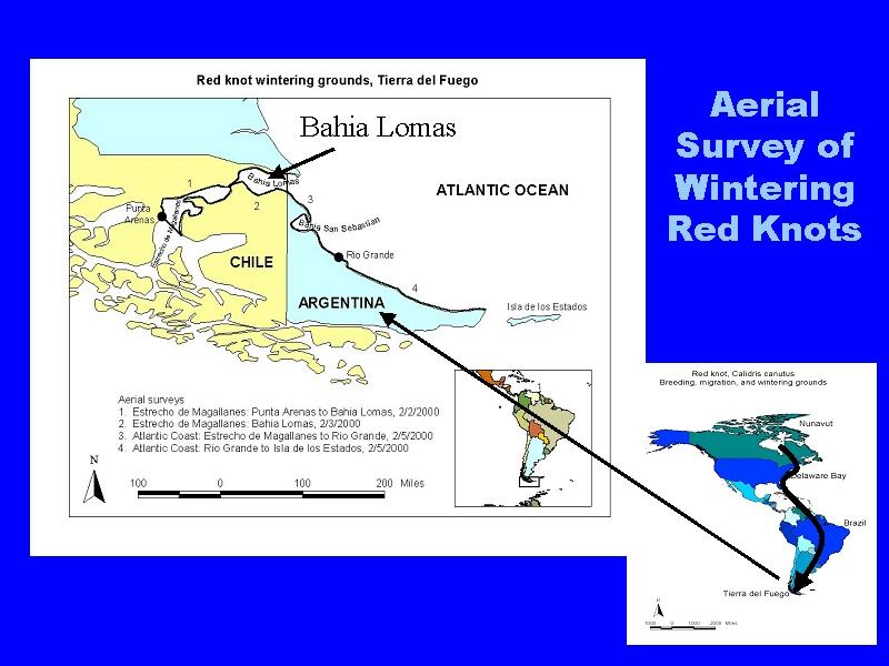 In South America, the ENSP partnered with several other agencies to survey the wintering red knot. Conducted in the harsh and windy terrain of Tierra Del Fuego our survey covered 90% of the wintering knot habitat in South America. Most of the birds concentrated in just three sites, Rio Grande and Bahia San Sebastion in Argentina and Bahia Lomas in Chile.