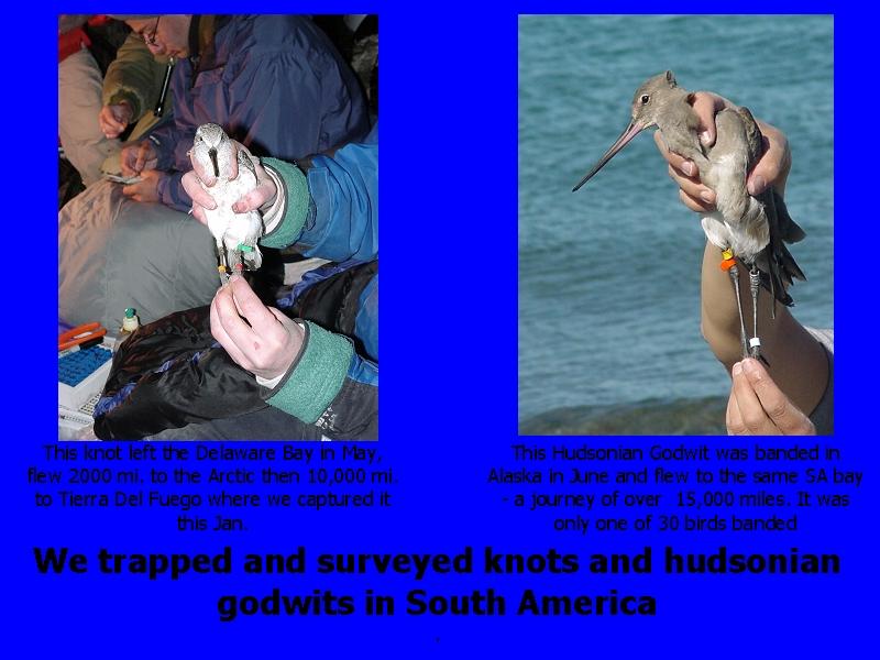 Our team trapped birds and found knots that had been banded on the Delaware Bay and one hudsonian godwit banded in Alaska. The godwits provided a good comparison because they migrate a longer distance than the red knot and don't stopover on the Delaware Bay