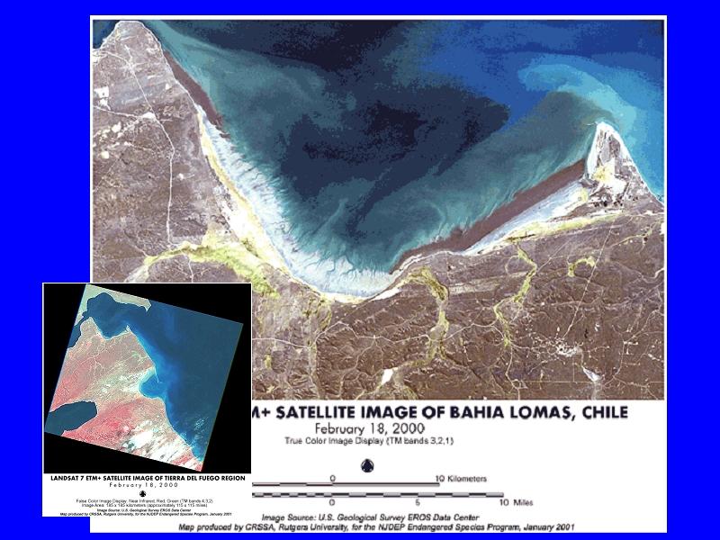 Most of the hemisphere’s red knots and godwits winter in Bahia Lomas in Chile. Lomas has an unusually small tidal range with many areas flooding only a few inches deep at high tide, even though there is a 30 ft tide flow in the adjacent Straits of Magellan. In our first survey we found 46,000 red knots on the bay.