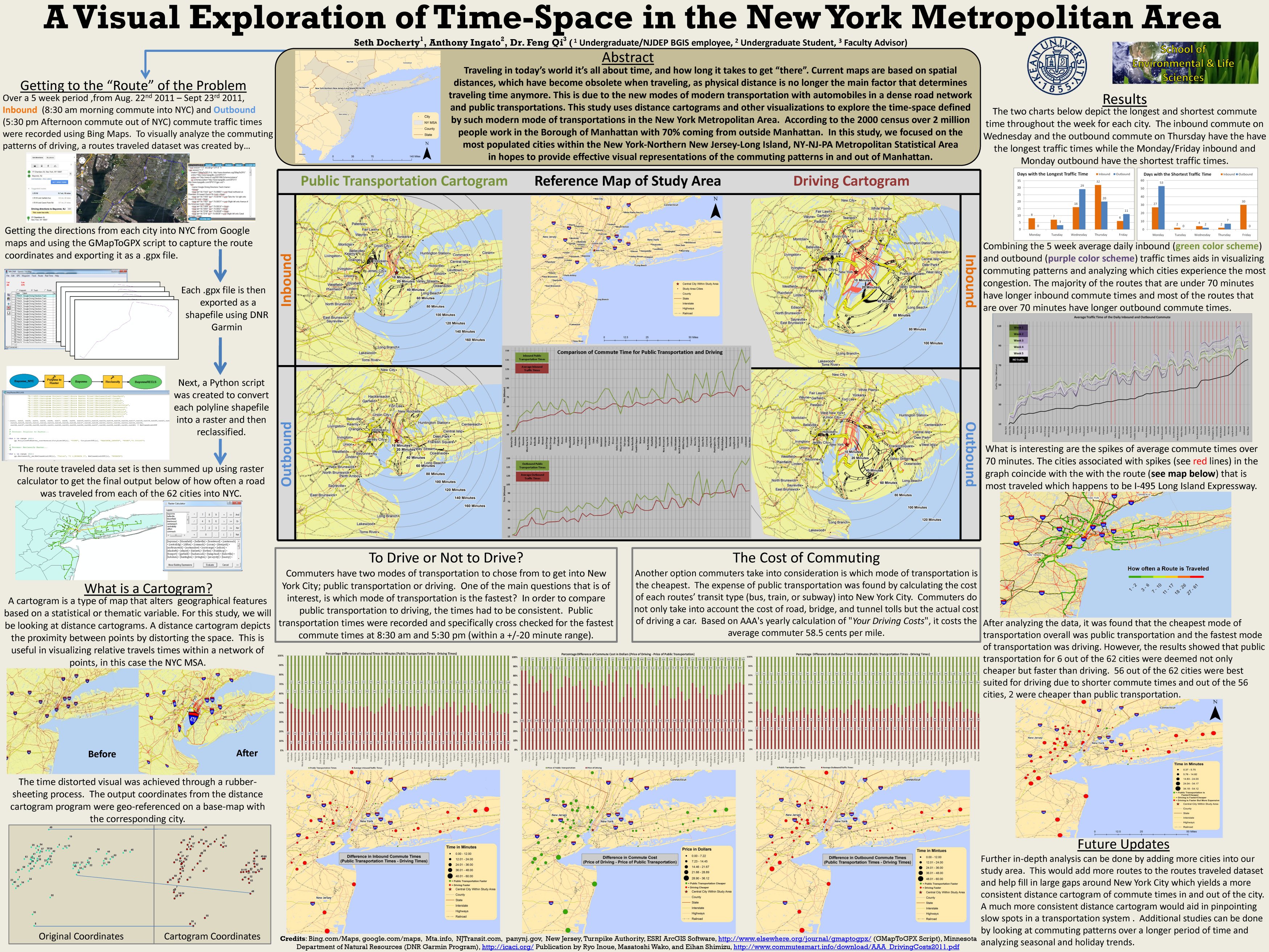 When traveling in today's world it's all about time, and how long it takes to get "there". Current maps are based on spatial distances, which have become obsolete when traveling, as physical distance is no longer the main factor that determines traveling time anymore. This is due to the new modes of modern transportation with automobiles in a dense road network and public transportations. The study was aimed at analyzing commuting patterns within the New York-Northern New Jersey-Long Island, NY-NJ-PA Metropolitan Statistical Area and three questions we were interested in answering were: |