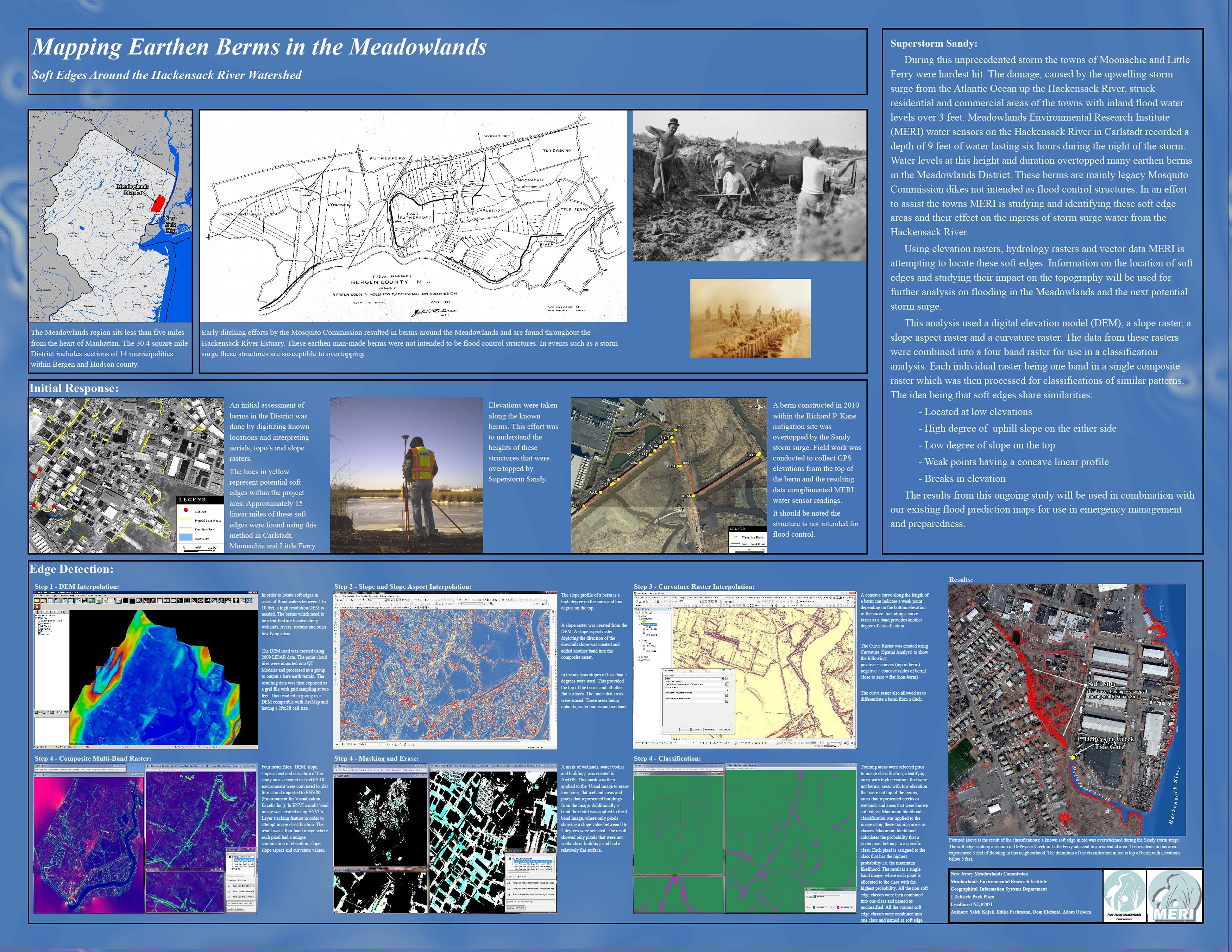 In the Meadowlands District a berm is a raised ridge of earth that results from excavating drainage ditches as a mosquito control strategy to prevent standing water in low-lying areas. Earthen berms also prevent waters from high tides from reaching and ponding in the low lying meadows. Between 1913 and the late 1970's hundreds of miles of ditches were dug in the vicinity of the towns of Carlstadt, Little Ferry and Moonachie and the average berm height was about 5 feet above sea level. Until super storm Sandy, this berm system protected the residential and industrial areas of these towns from the highest of the high tides. Sandy's sea surge measured 8.5 to 9.5 feet and overtopped all existing earthen berms. Using LIDAR, Hyperspectral Remote Sensing and digital terrain models the Meadowlands Environmental Research Institute (MERI)-Geographical Information Systems (GIS) team has embarked in a project to precisely map the location and the elevation of all legacy berms in these low lying towns. Specifically, identify "soft edges", i.e. berms that are less than 5 feet in elevation, within the more than 100 miles of earthen berms and locate areas and neighborhoods most at risk from sea surge flooding. |