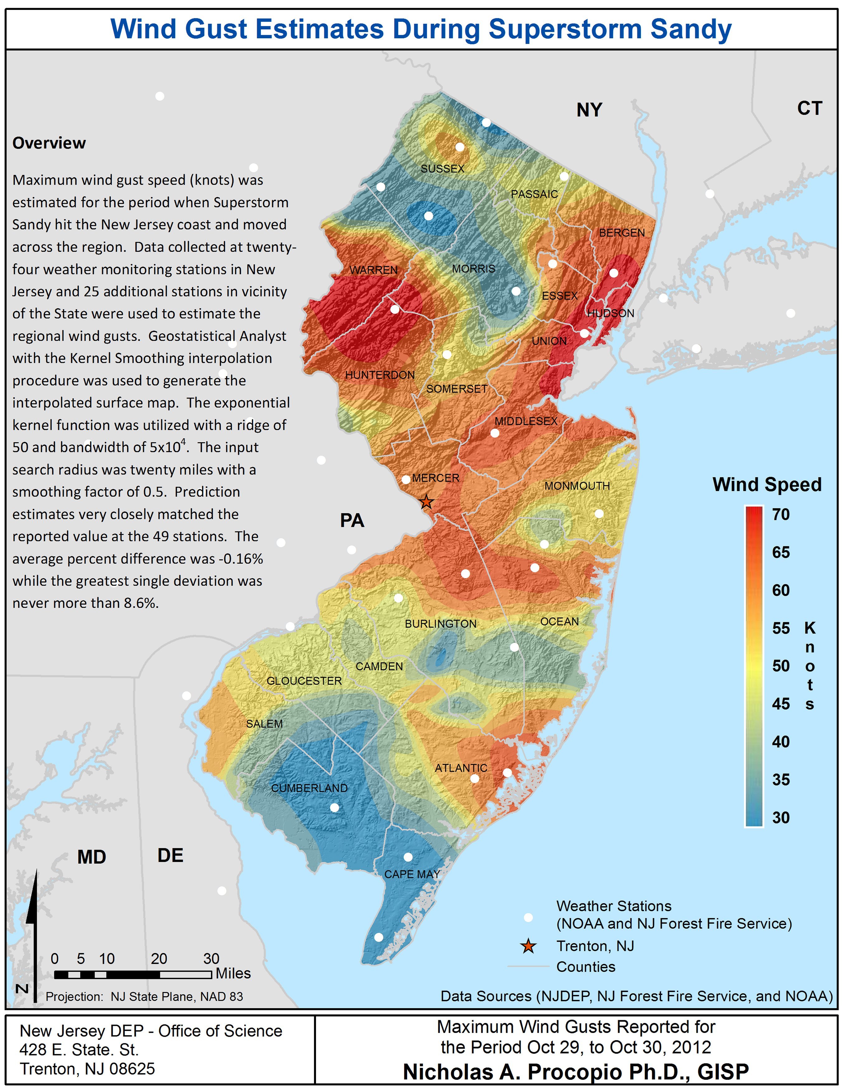 Maximum wind gust speed (knots) was estimated for the period when Superstorm Sandy hit the New Jersey coast and moved across the region. Data collected at twenty-four weather monitoring stations in New Jersey and twenty-five additional stations in vicinity of the State were used to estimate the regional wind gusts. Geostatistical Analyst with the Kernel Smoothing interpolation procedure was used to generate the interpolated surface map. The exponential kernel function was utilized with a ridge of 50 and bandwidth of 5x104. The input search radius was twenty miles with a smoothing factor of 0.5. Prediction estimates very closely matched the reported value at the 49 stations. The average percent difference was -0.16% while the greatest single deviation was never more than 8.6%. The model had a root-mean-square error (RMS) of 11.5. |