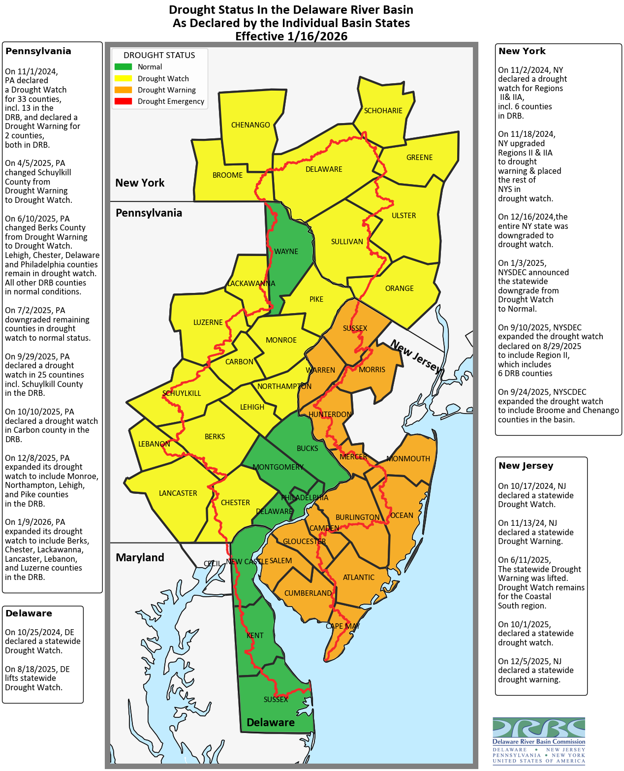 - After a December 4, 2025, meeting of its Drought Task Force, Pennsylvania placed an additional eight counties in drought watch, including Lehigh, Northampton, Monroe and Pike counties in the DRB.