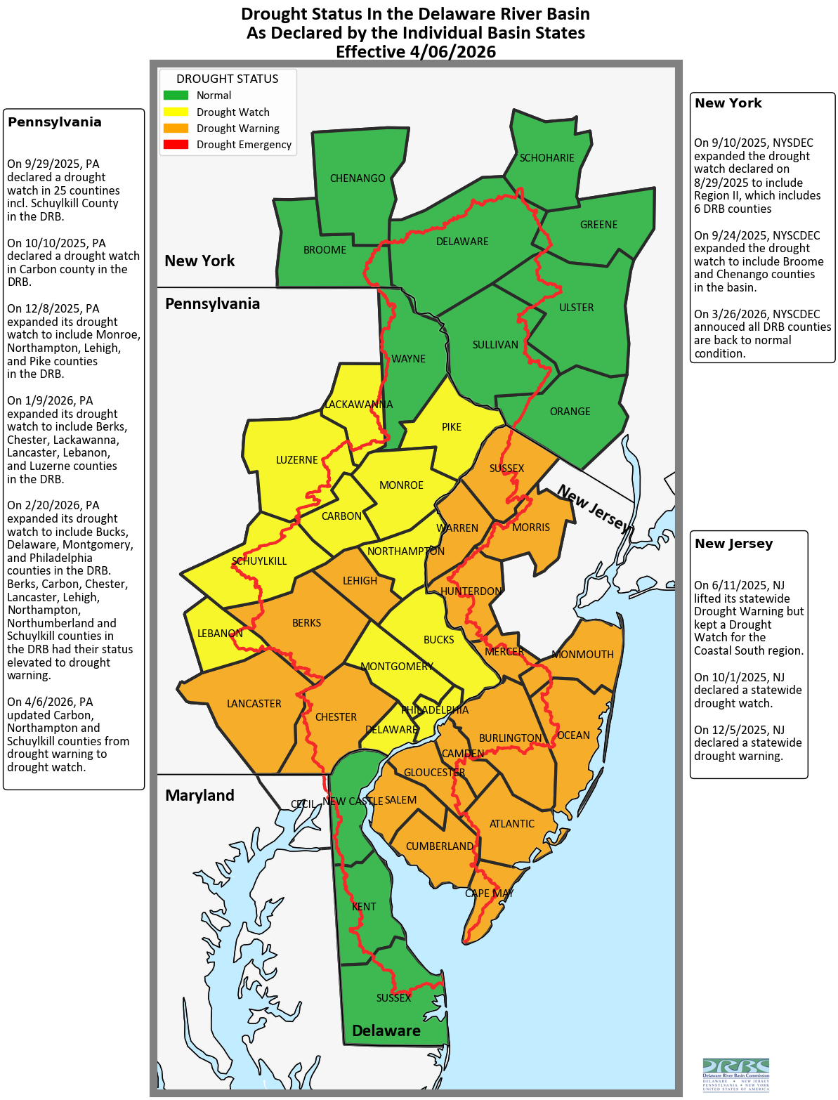 - After a February 18, 2026, meeting of its Drought Task Force, Pennsylvania placed an additional 11 counties in drought watch, including Bucks, Delaware, Montgomery and Philadelphia counties in the DRB. Sixteen counties had their drought status elevated to drought warning, including Berks, Carbon, Chester, Lancaster, Lehigh, Northampton and Schuylkill counties in the DRB. Wayne County is the only DRB PA county that is in normal conditions.