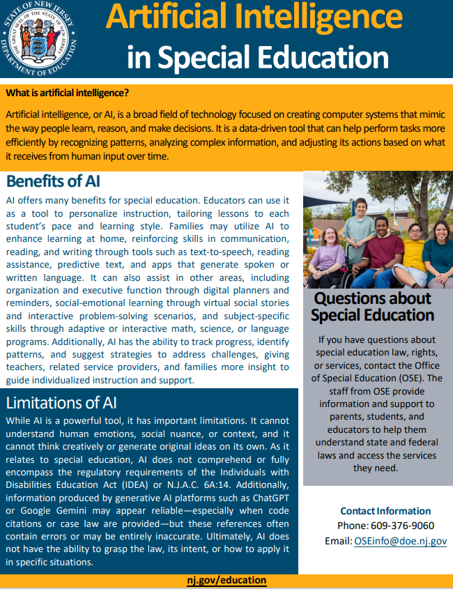 In New Jersey, the Department of Education’s (DOE) Office of Special Education (OSE) provides oversight and guidance to ensure that local education agencies (LEAs) comply with IDEA and state-specific special education requirements. Families may access supports through the OSE and through organizations such as the Statewide Parent Advocacy Network (SPAN), which serves as New Jersey’s federally designated Parent Training and Information Center (PTI), offering technical assistance, training, and resources related to special education rights and procedures.