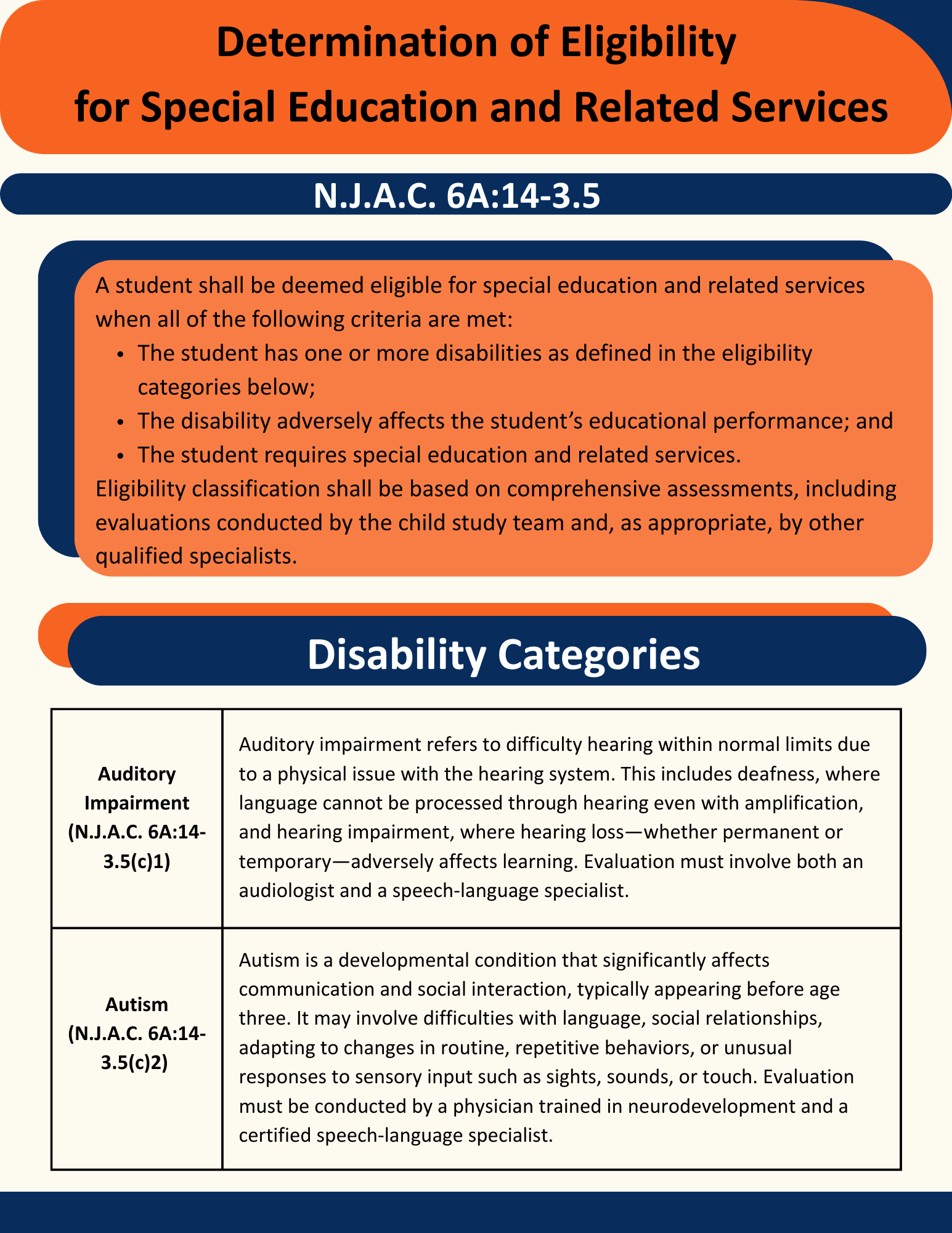 A student shall be deemed eligible for special education and related services when all of the following criteria are met:
