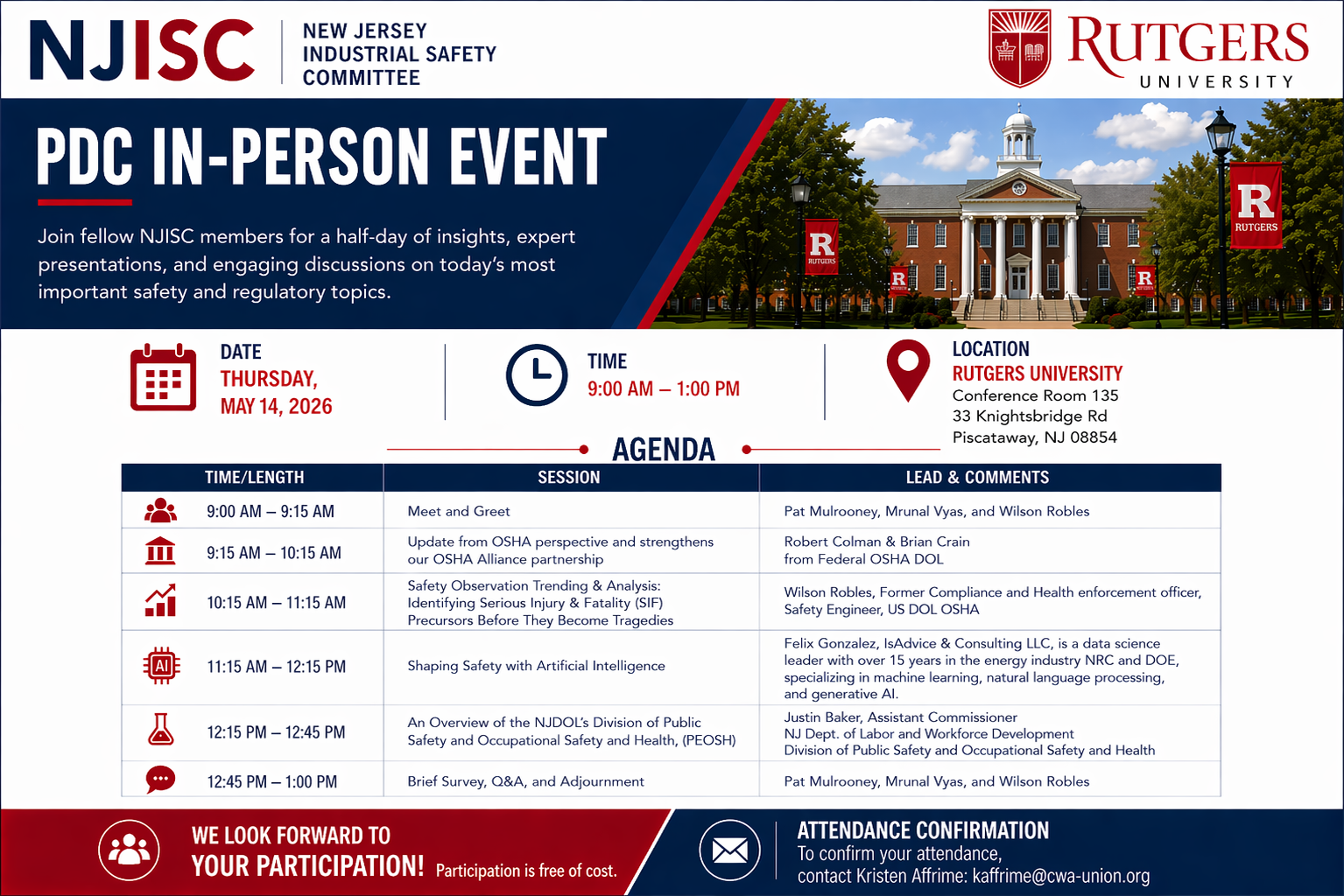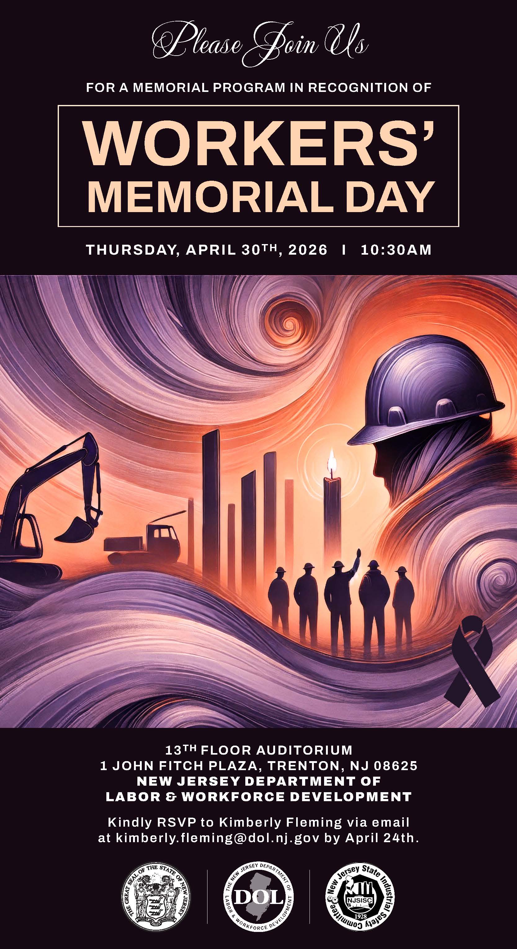 A Workers Memorial Day event will be held on Thursday, April 30 at the NJ Department of Labor and Workforce Development, 1 John Fitch Way, Trenton. The event will include speakers from the New Jersey State Industrial Safety Committee, the New Jersey Department of Labor and Workforce Development, and the Occupational Safety and Health Administration. View the 2026 Workers Memorial Day Event program here.