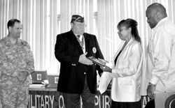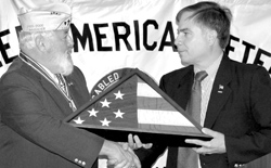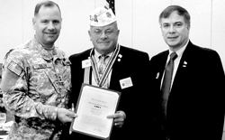Maj. Gen. Glenn K. Rieth (left) assists Military Order of the DMAVA Visits The Veterans' Conventions Purple Heart State Commander Dennis Moriarty (second from left) with a presentation to the next of kin of New Jersey troops killed in action. General Rieth (left) and Deputy Commissioner Abel (right) present State Commander Joseph Gugliuzza (center) the New Jersey Distinguished Service Medal at the American Legion convention.