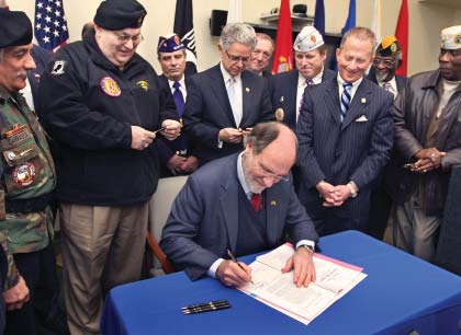 Roman P. Nidzwiedz (second from left), Assemblyman Jack Conners (fourth from left) and Senator Jeff Van Drew (third from right), along with veterans group representatives watch as Governor Jon S. Corzine (seated) signs into law A2613/S1579 granting veteran organizations the right to receive unclaimed veterans cremains and ensure that they receive a proper military burial.