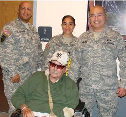 Paramus Veterans Memorial Home resident John Semoldoni, seated, poses with, left to right, Sgt. 1st Class John Figueroa, Spc. Deiree Morales and Tech. Sgt. Duy Nguyen on Nov. 9, 2010. Each year the New Jersey Counterdrug Task Force visits the Menlo Park, Paramus and Vineland Veterans Memorial Homes to spend time with fellow veterans. U.S. Army photo by Master Sgt. Joseph P. Prieto.