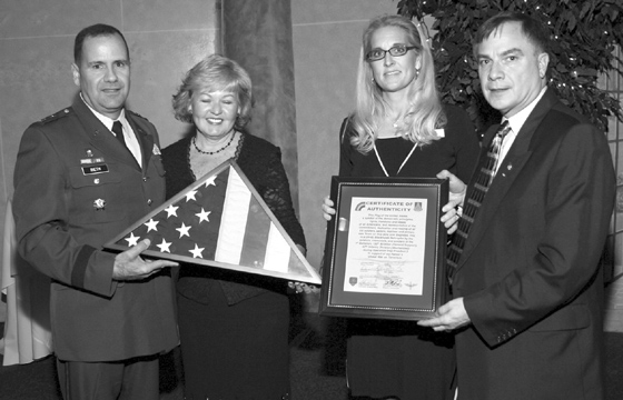 Stephen G. Abel, Deputy Commissioner for Veterans Affairs, center, accepts the $5,000 check from Raymond Zawacki, Department Adjutant, left and Joseph Gugliuzza, Department Commander, right. Photo by Kryn P. Westhoven, DMAVA/PA. | VVMF Celebrates 10th Anniversary On Oct. 27, the New Jersey Vietnam Veterans’ Memorial Foundation celebrated its 10th Anniversary and held its Third Annual Gala, “A Salute to Patriotism” at the Vietnam Era Educational Center and the Robert B. Meyner Reception Center, located on the grounds of the PNC Bank Arts Center, Holmdel. This event brought together corporate, political and veterans’ community leaders to recognize and honor veterans and those who are dedicated to helping veterans. Former Georgia Senator Max Cleland and Maj. Gen. Charles F. Bolden, Jr., both provided stirring remarks. Severely wounded during his tour in Vietnam, Senator Cleland headed the Veterans Administration during the Carter Administration and his advocacy on behalf of veterans is well known. Maj. Gen. Bolden, a decorated Vietnam veteran flew four missions aboard the Space Shuttle. The gathering was also treated to a superb precision drill demonstration by a troop from the Rahway High School Marine Junior ROTC Unit.