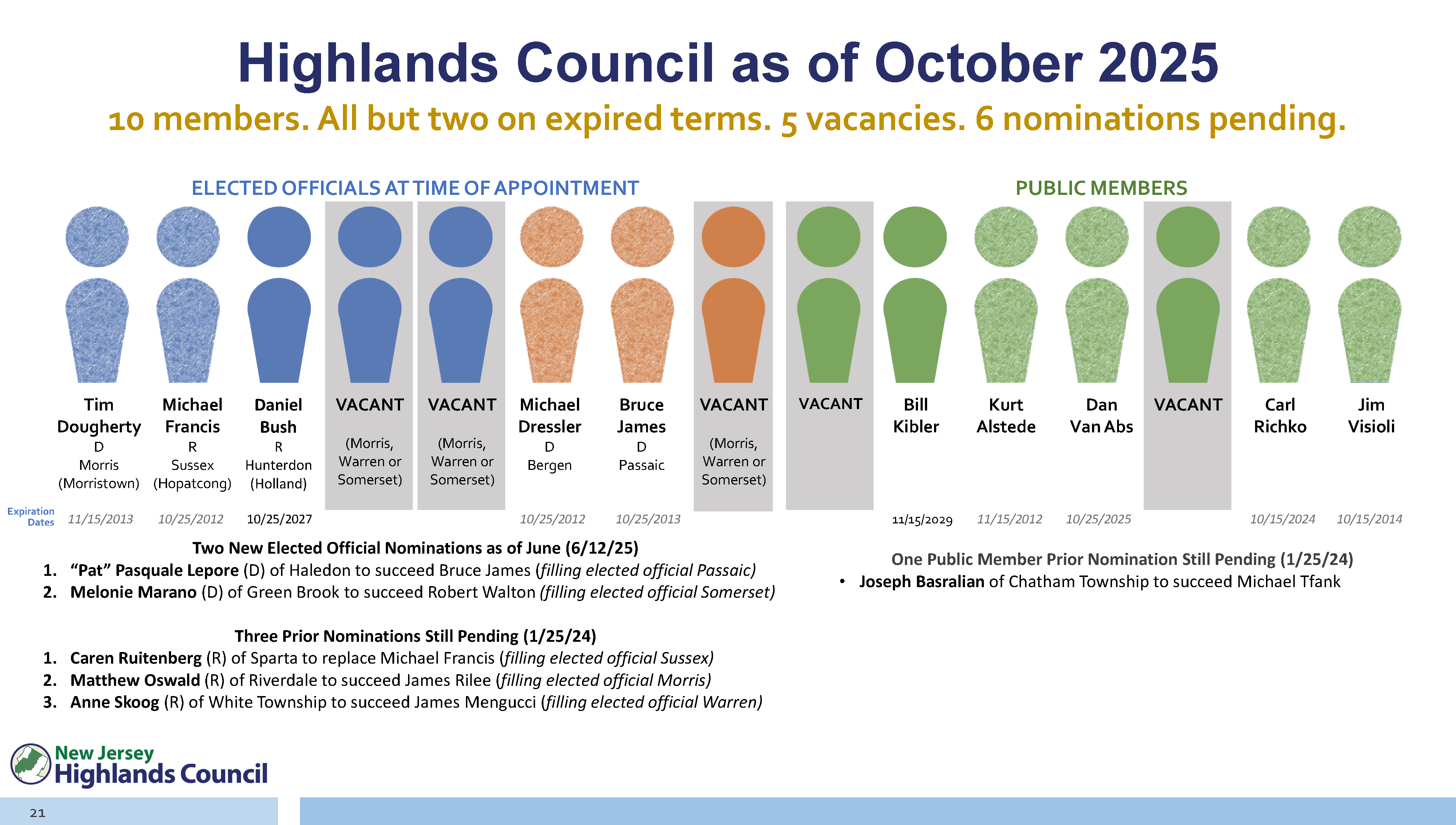 The Highlands Council is a 15-member appointed body tasked with implementation of the New Jersey Highlands Water Protection and Planning Act of 2004. There are currently five vacancies on the Council. Appointments to the Highlands Council are overseen by the Appointments Office.