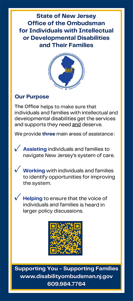 The Office of the Ombudsman for Individuals with Intellectual or Developmental Disabilities and Their Families was established by the State Legislature in December 2017 to serve individuals and their families – to help make sure that they get the services and supports they need and deserve.